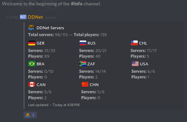 The info channel displays DDNet server statistics: